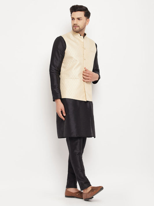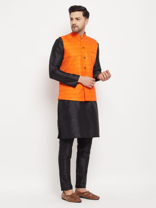 Men's Black Silk Blend Straight Jacket Kurta and Pyjama Set
