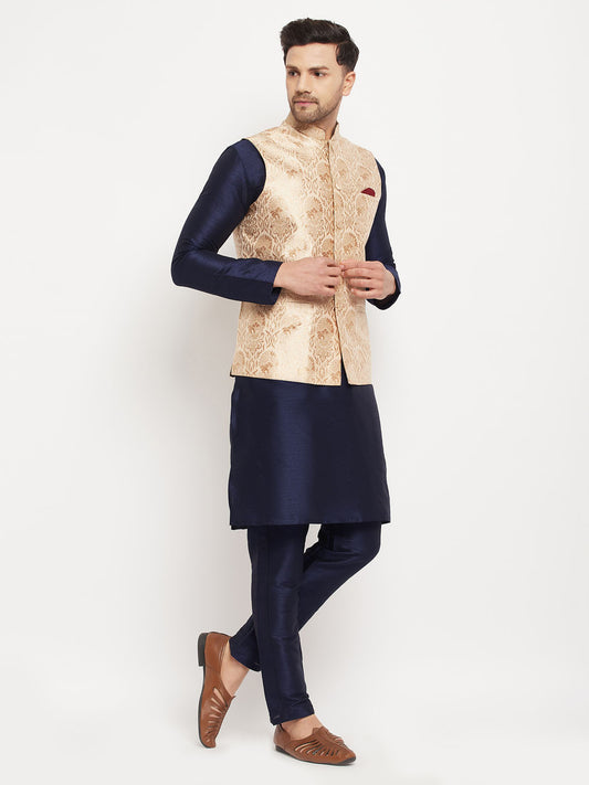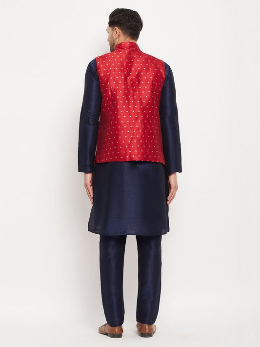 Men's Navy Blue Silk Blend Straight Jacket Kurta and Pyjama Set