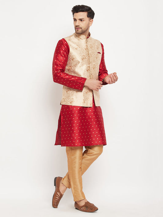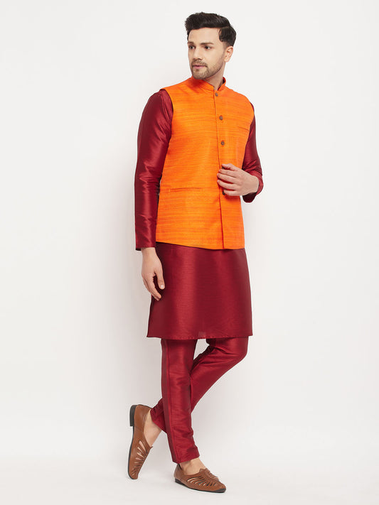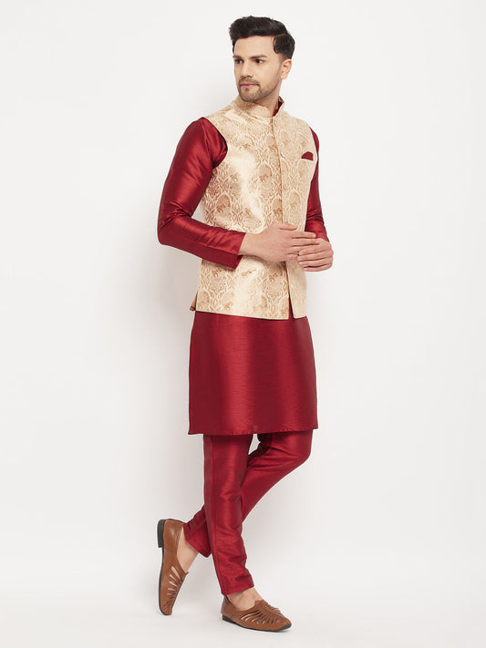 Men's Maroon Silk Blend Straight Jacket Kurta and Pyjama Set