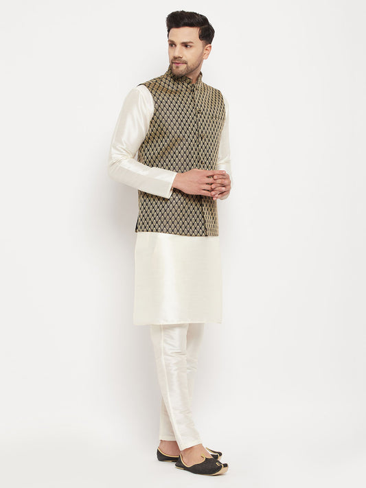 Men's Cream Silk Blend Straight Jacket Kurta and Pyjama Set
