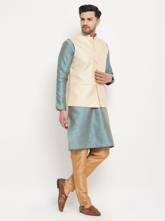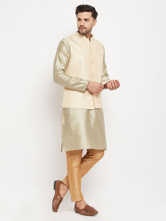 Men's Beige Silk Blend Straight Jacket Kurta and Pyjama Set