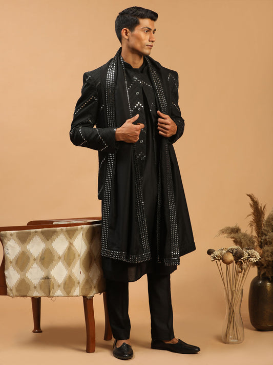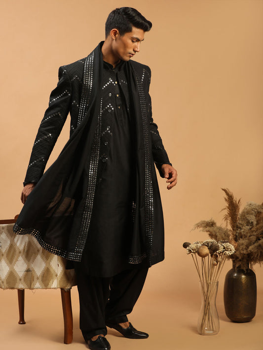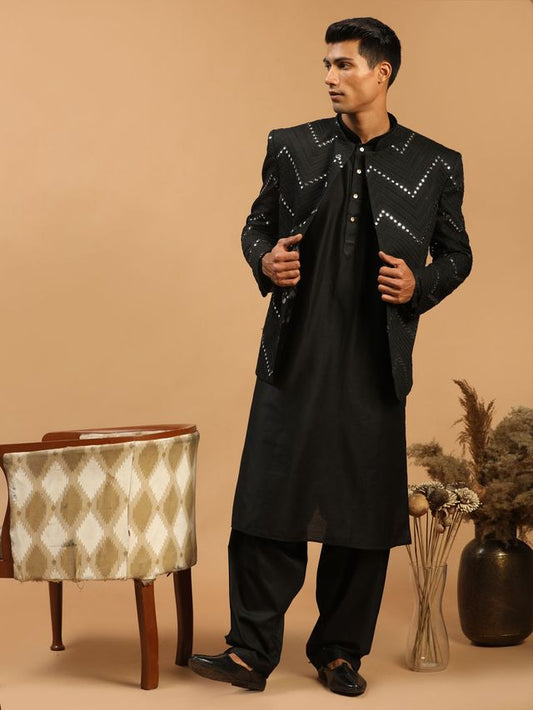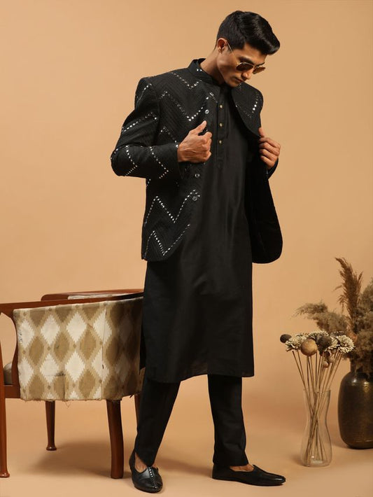 Men's Black Silk Blend Straight Jacket Kurta and Pyjama Set