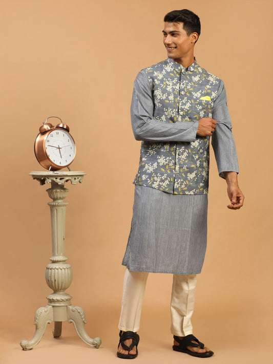 Men's Grey Cotton Blend Straight Jacket Kurta and Pyjama Set