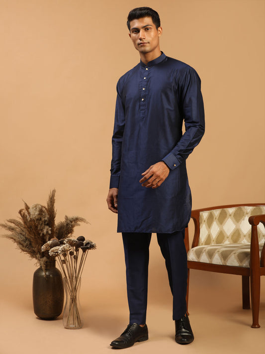Men's Navy Blue Viscose Curved Kurta Pyjama Set