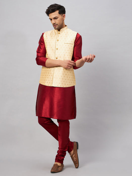 Men's Maroon Silk Blend Straight Jacket Kurta and Pyjama Set