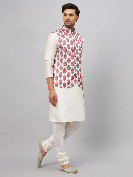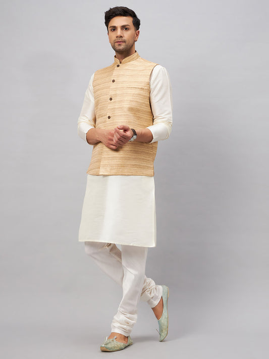 Men's Cream Silk Blend Straight Jacket Kurta and Pyjama Set
