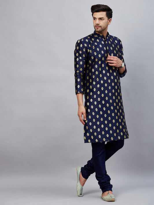 Men's Navy Blue Dupion Silk Straight Kurta Pyjama Set