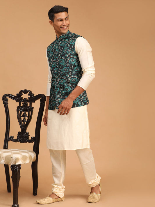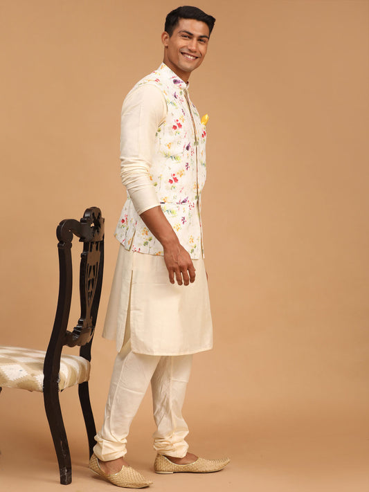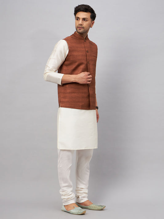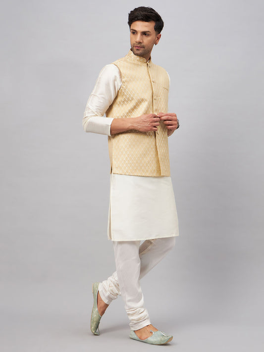 Men's Cream Silk Blend Straight Jacket Kurta and Pyjama Set