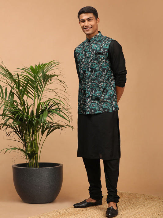 Men's Black Silk Blend Straight Jacket Kurta and Pyjama Set
