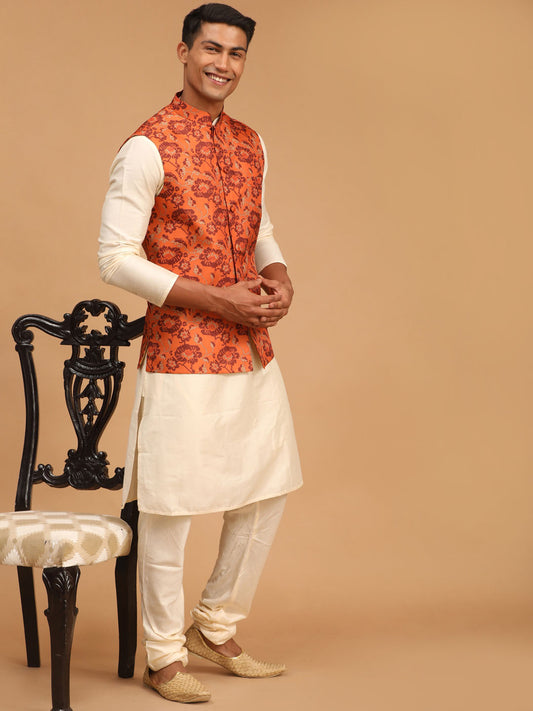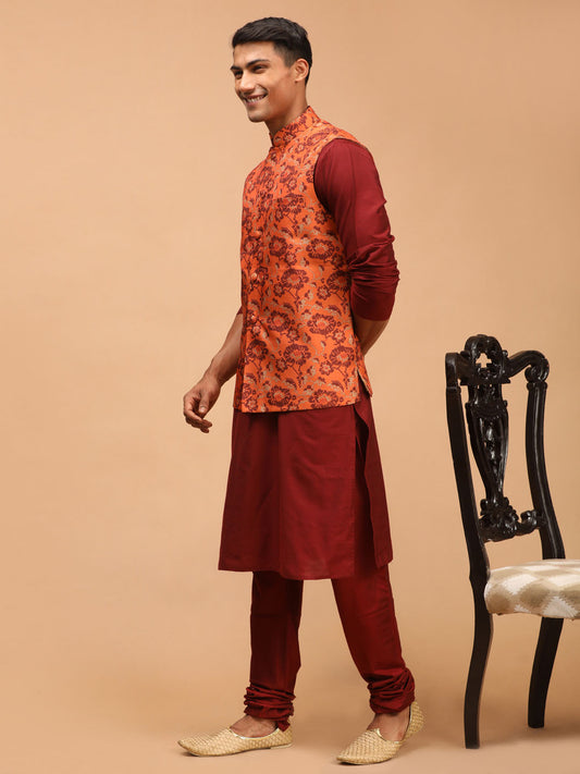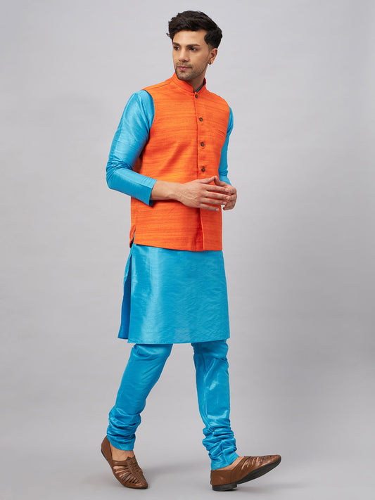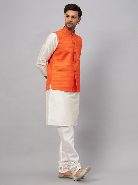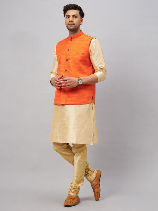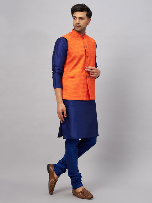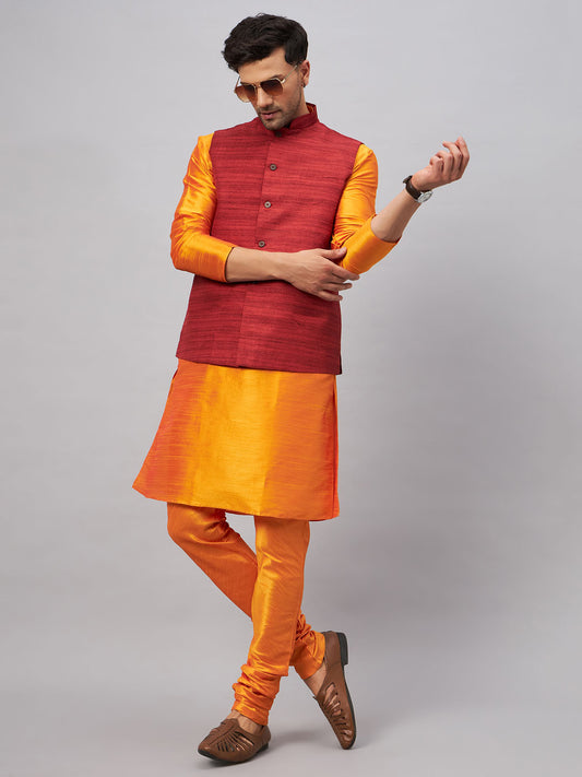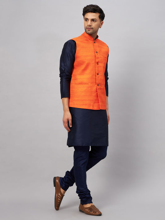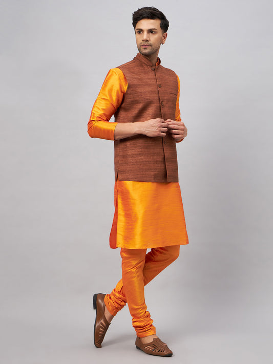 Men's Orange Silk Blend Straight Jacket Kurta and Pyjama Set