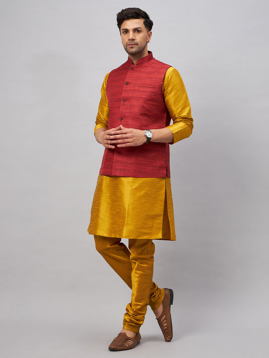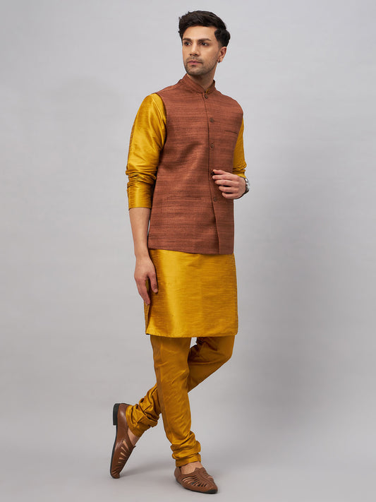 Men's Mustard Silk Blend Straight Jacket Kurta and Pyjama Set