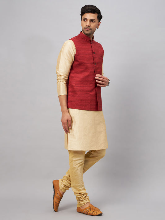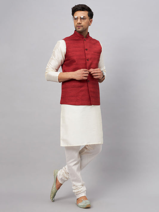 Men's Maroon Silk Blend Straight Jacket Kurta and Pyjama Set