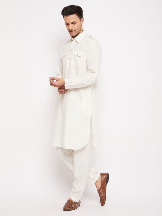 Men's Cream Cotton Blend Pathani Pathani Kurta Set