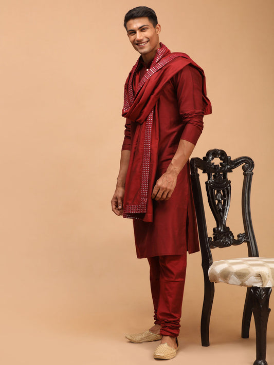 Men's Maroon Viscose Straight Kurta Pyjama & Dupatta Set