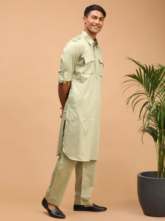 Men's Green Cotton Blend Pathani Pathani Kurta Set