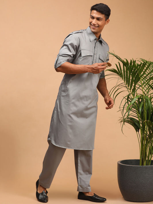 Men's Grey Cotton Blend Pathani Pathani Kurta Set