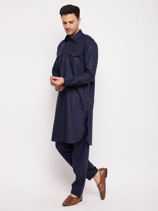 Men's Blue Cotton Blend Pathani Pathani Kurta Set
