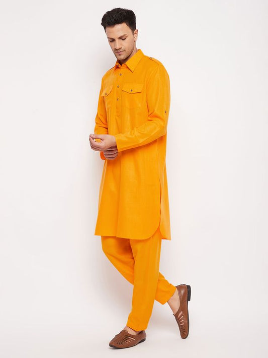 Men's Mustard Cotton Blend Pathani Pathani Kurta Set