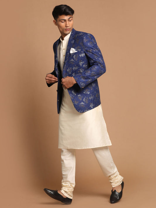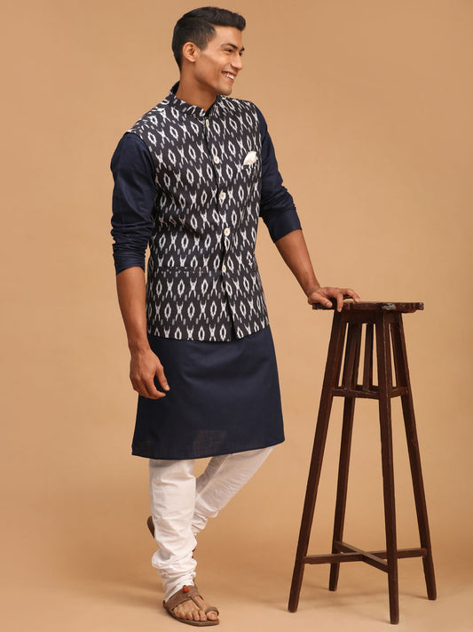 Men's Navy Blue Cotton Blend Straight Jacket Kurta and Pyjama Set