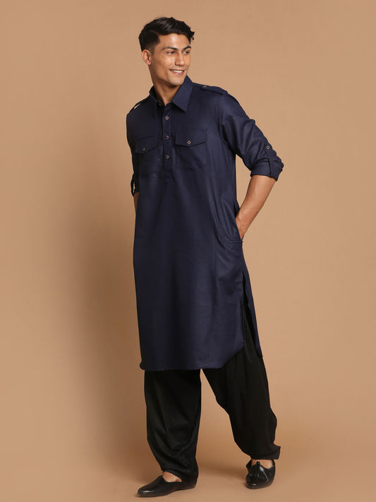 Men's Blue Cotton Blend Pathani Pathani Kurta Set