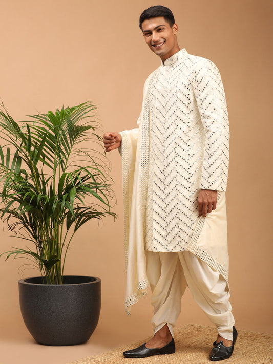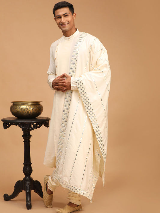 Men's Cream Viscose Blend Asymmetric Kurta Pyjama & Dupatta Set