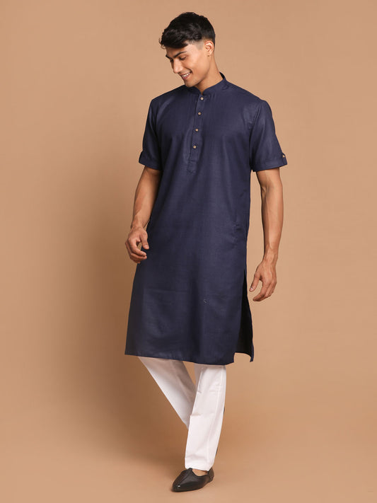 Men's Navy Blue Cotton Blend Straight Kurta Pyjama Set