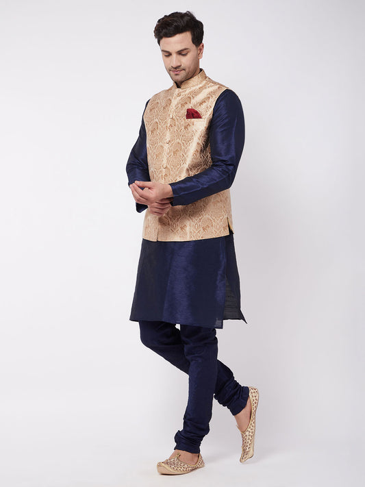 Men's Navy Blue Silk Blend Straight Jacket Kurta and Pyjama Set