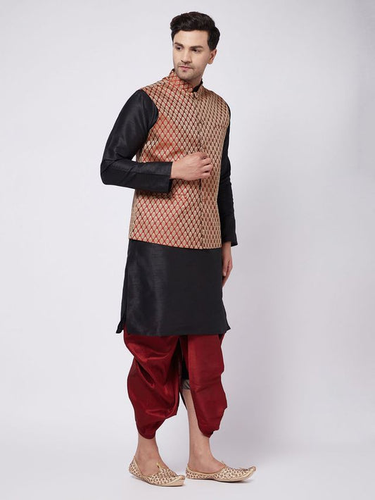 Men's Black Silk Blend Straight Jacket Kurta and Dhoti Set