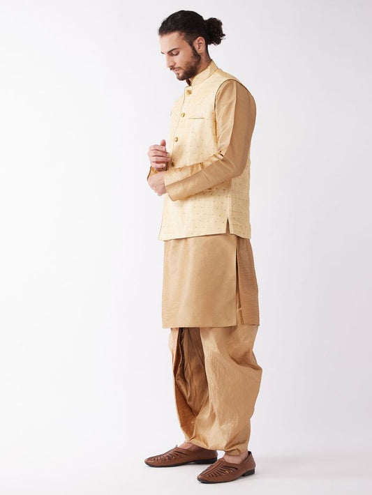 Men's Gold Silk Blend Straight Jacket Kurta and Dhoti Set
