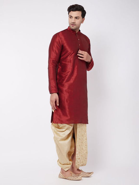 Men's Maroon Silk Blend Straight Kurta and Dhoti Set
