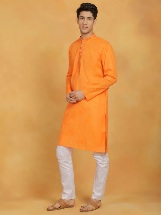 Men's Orange Cotton Straight Kurta Pyjama Set