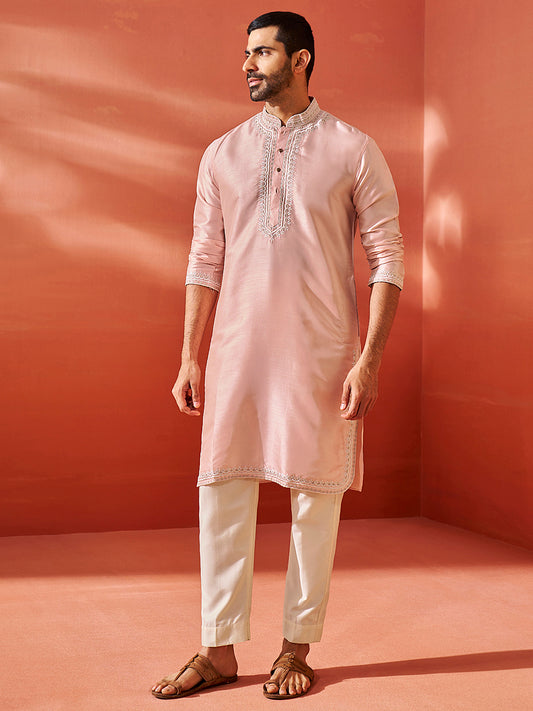 Men's Peach Silk Blend Straight Kurta And Pyjama Set.