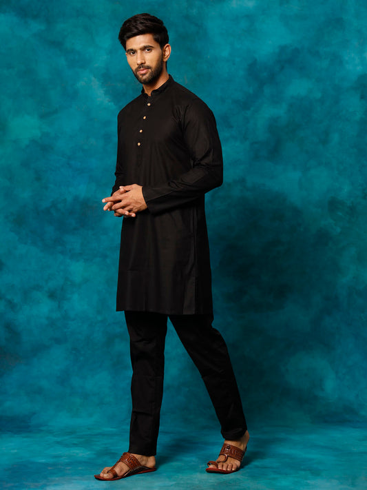 Men's Black Cotton Cotton Satin Asymmetric Kurta Pyjama Set