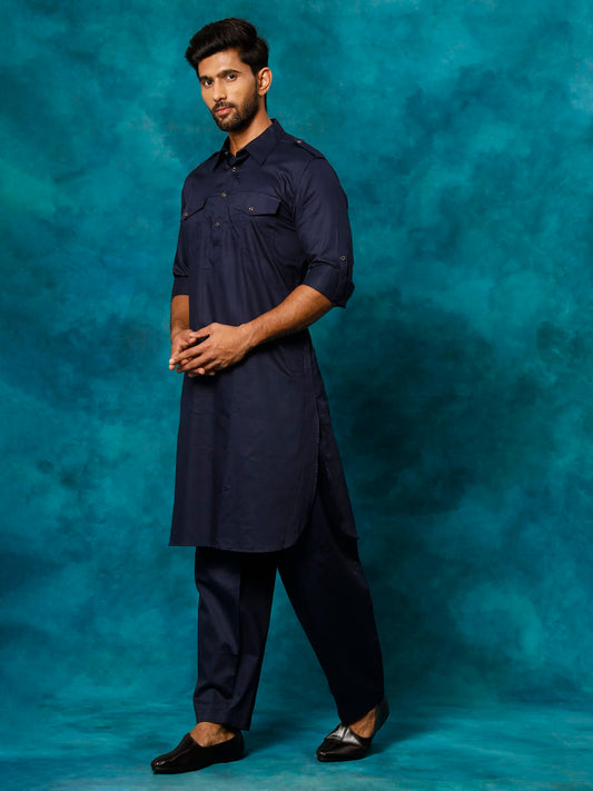 Men's Blue Cotton Blend Pathani Pathani Kurta Set