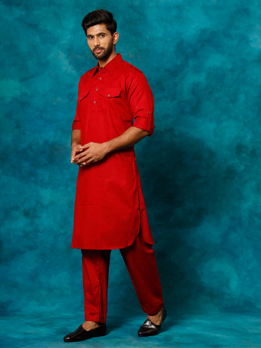 Men's Maroon Cotton Blend Pathani Pathani Kurta Set