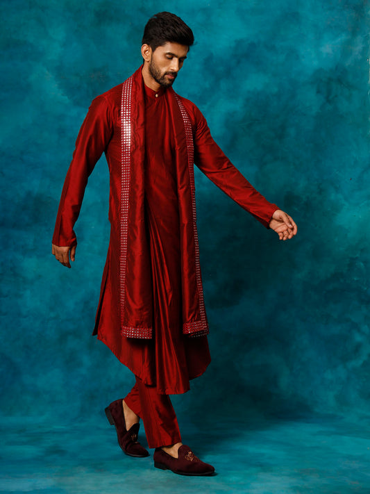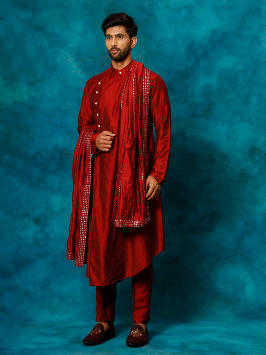 Men's Maroon Viscose Blend Asymmetric Kurta Pyjama & Dupatta Set