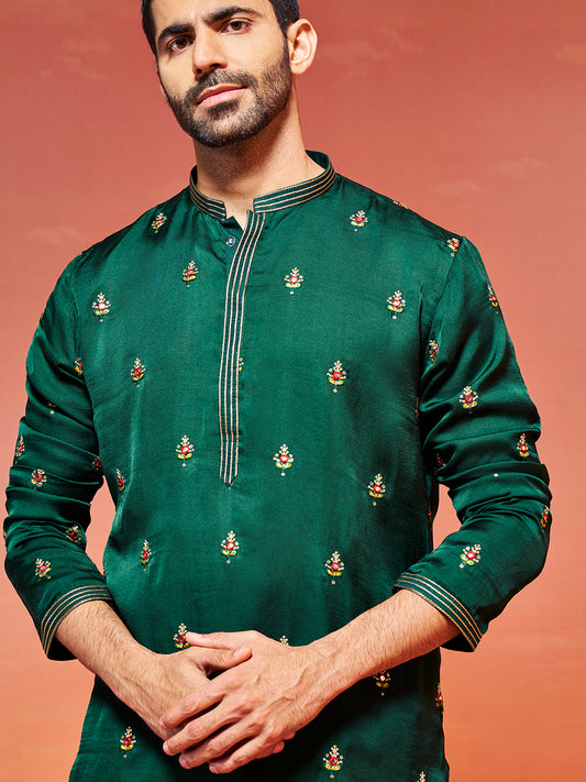 Men's Bottle Green Silk Blend Straight Kurta And Pyjama Set