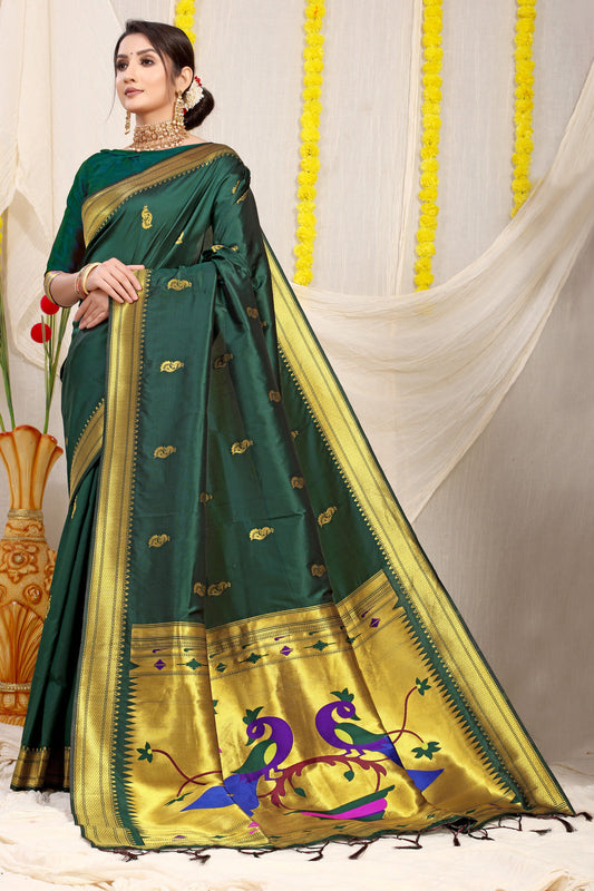 Dhiyona GR Women's Fancy Mor Bottle Green Zari Paithani Silk Saree