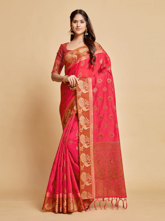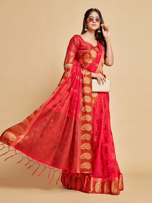 Dhiyona GR Women's Avantika Fiery Rose Zari Woven Design Chanderi Cotton Saree