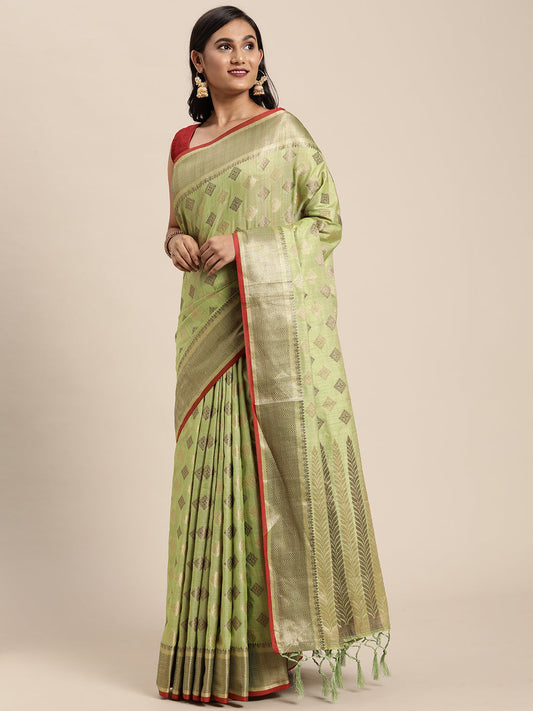 Dhiyona GR Women's Aarya Pear Green Zari Woven Design Banarasi Pure Cotton Saree