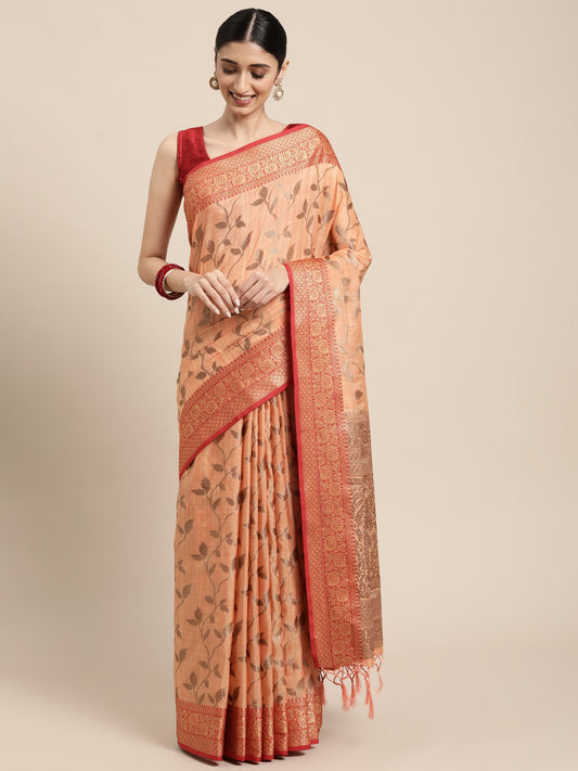 Dhiyona GR Women's Kesar Peach Orange Zari Woven Design Banarasi Pure Cotton Saree