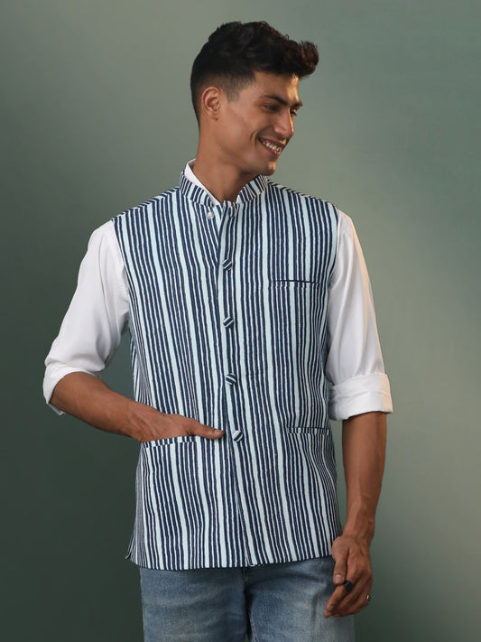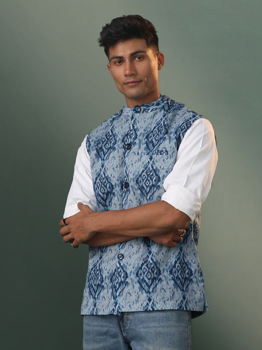 Men's Indigo Blue Cotton Straight Nehru Jacket