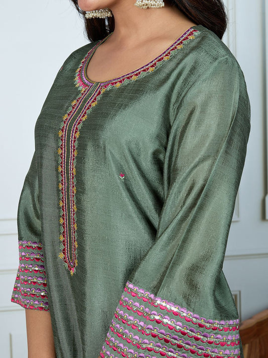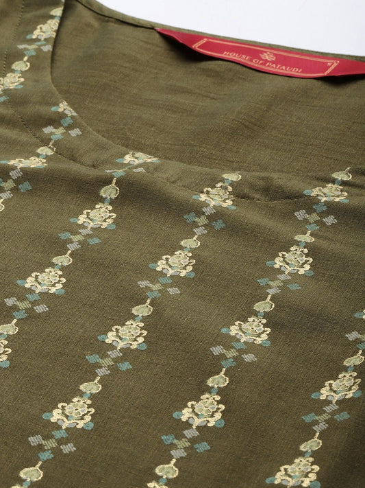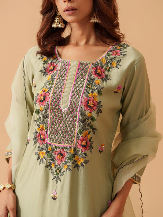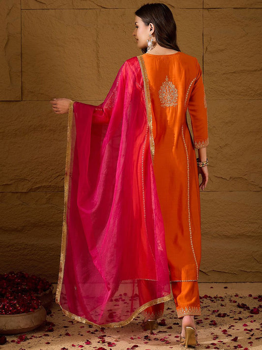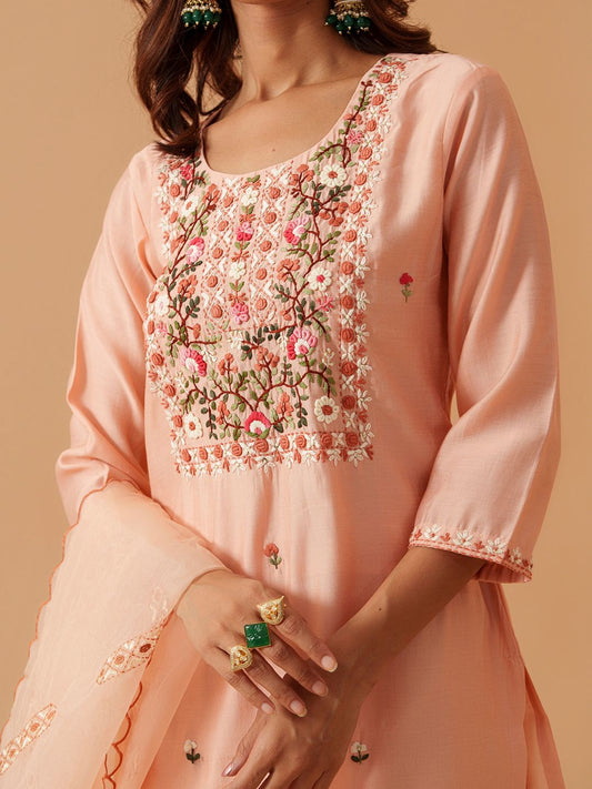 Dhiyona PD Women Floral Embroidered V-Neck Chanderi Cotton Kurta & Trousers With Dupatta