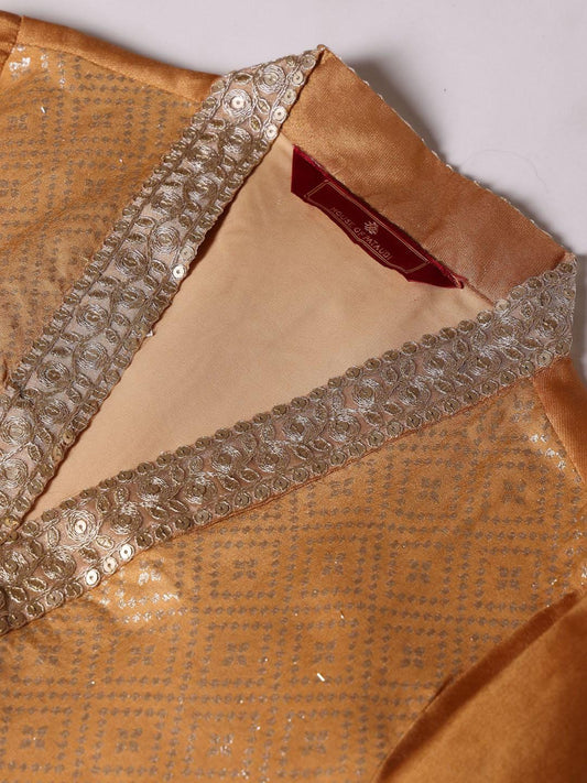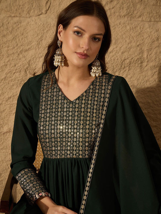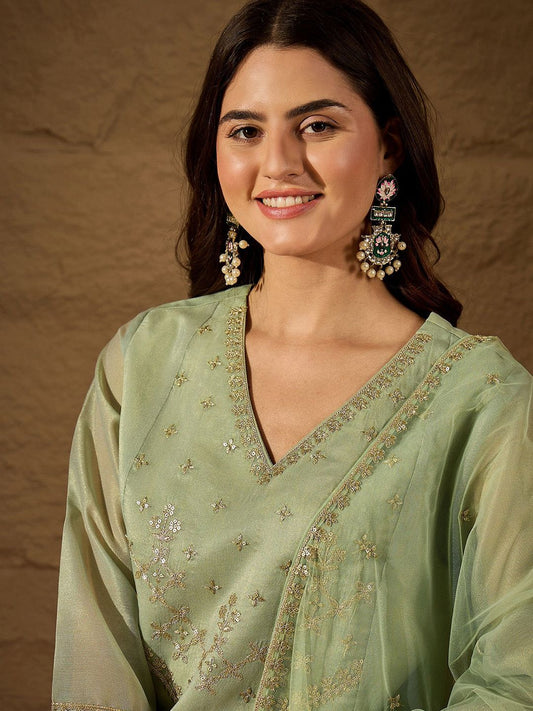 Dhiyona PD Women Yoke Design V-Neck Sequinned Pleated Georgette Kurta & Trousers & Dupatta
