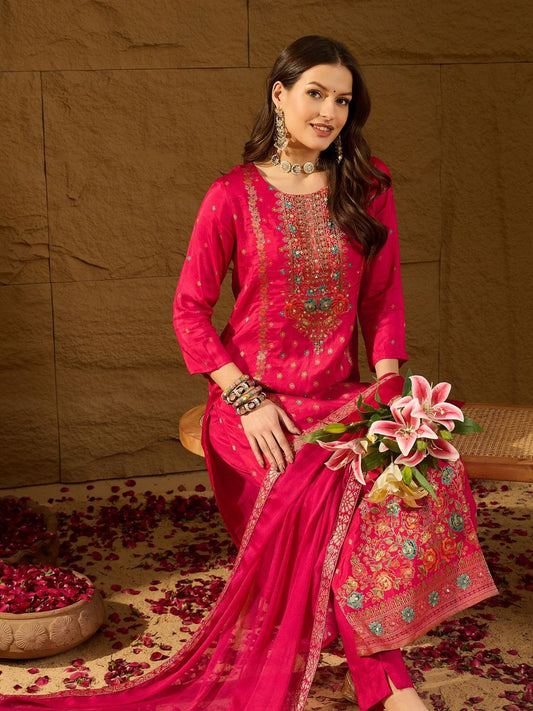 Dhiyona PD Women Woven Design Straight Kurta With Trouser And Dupatta