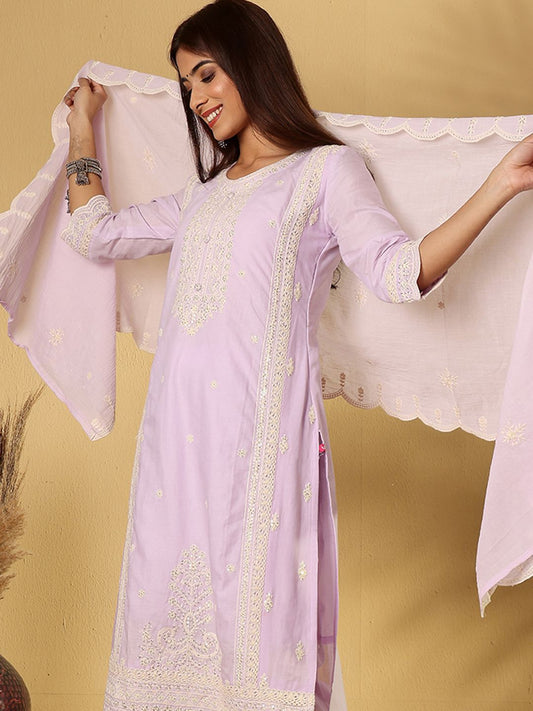 Dhiyona PD Women Floral Embroidered Pure Cotton Straight Kurta With Trousers And Dupatta