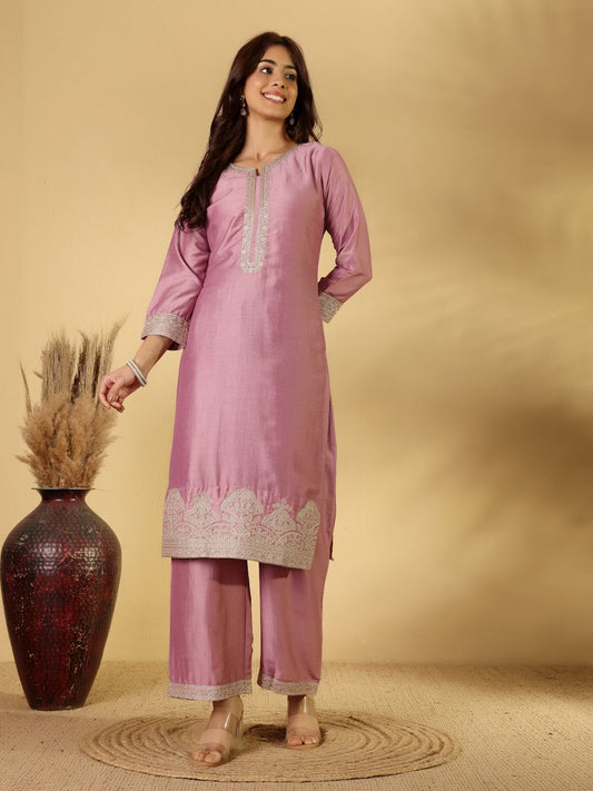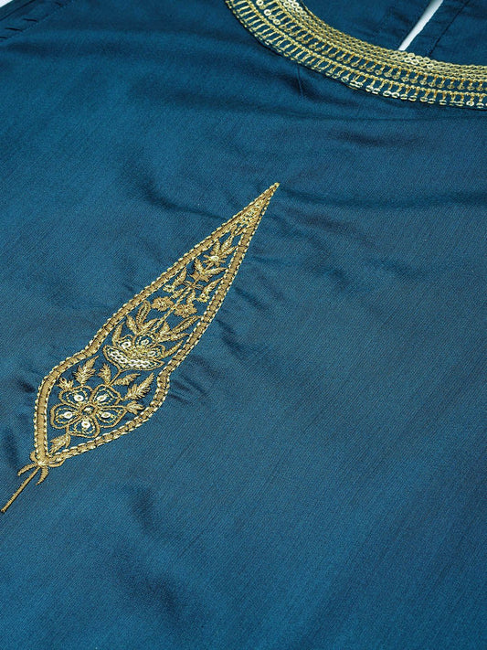 Dhiyona PD Women Embroidered Notch-Neck Straight Kurta With Trousers And Dupatta