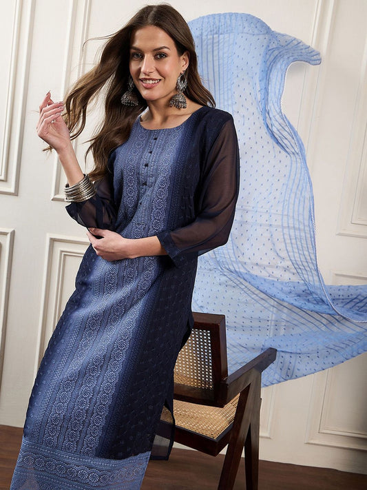 Buy 2 Get 1 FreeVendor:Dhiyona PDDhiyona PD Women Embroidered Ombre & Schiffli Straight Kurta With Trousers And Dupatta