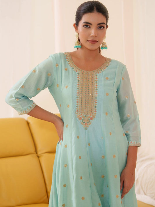 Dhiyona PD Women Floral Yoke Design Sequinned A-Line Kurta & Trousers With Dupatta