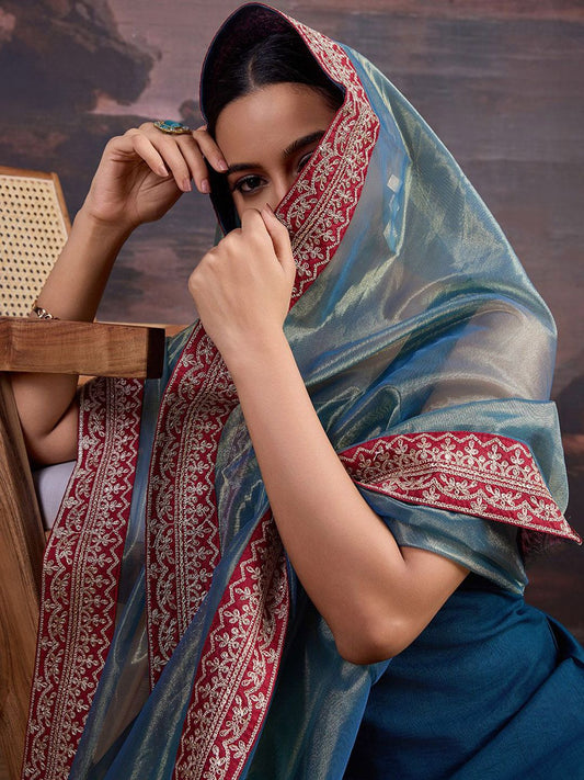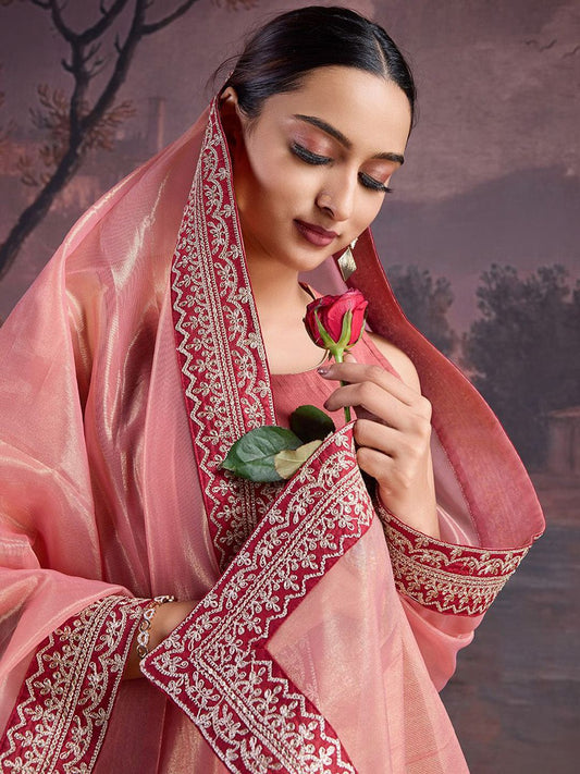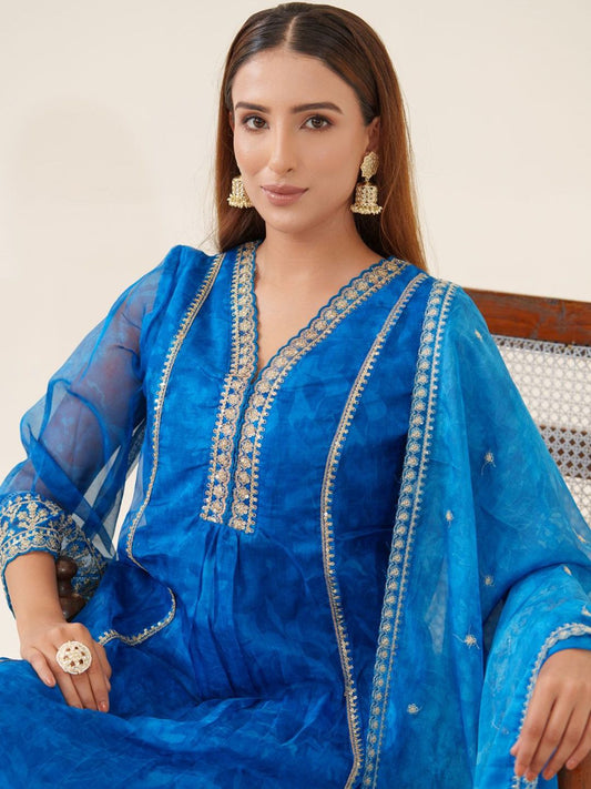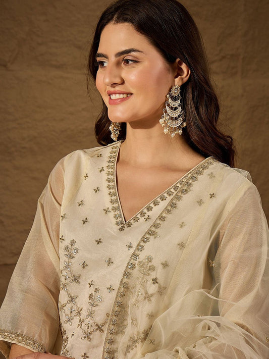 Dhiyona PD Women Floral Embroidered V-Neck Organza A-Line Kurta With Trousers & Dupatta